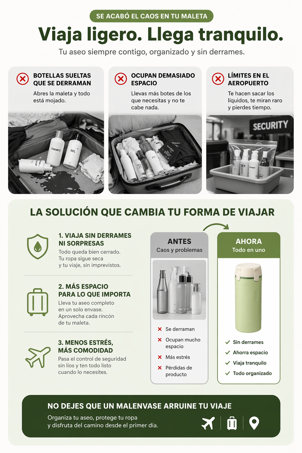 Antes siempre viajaba con mil botes sueltes y algunos acababan abriéndose en la maleta… un desastre. Desde que uso este dispensador llevo todo en uno y no he vuelto a tener fugas. Me ha ahorrado espacio y problemas.
