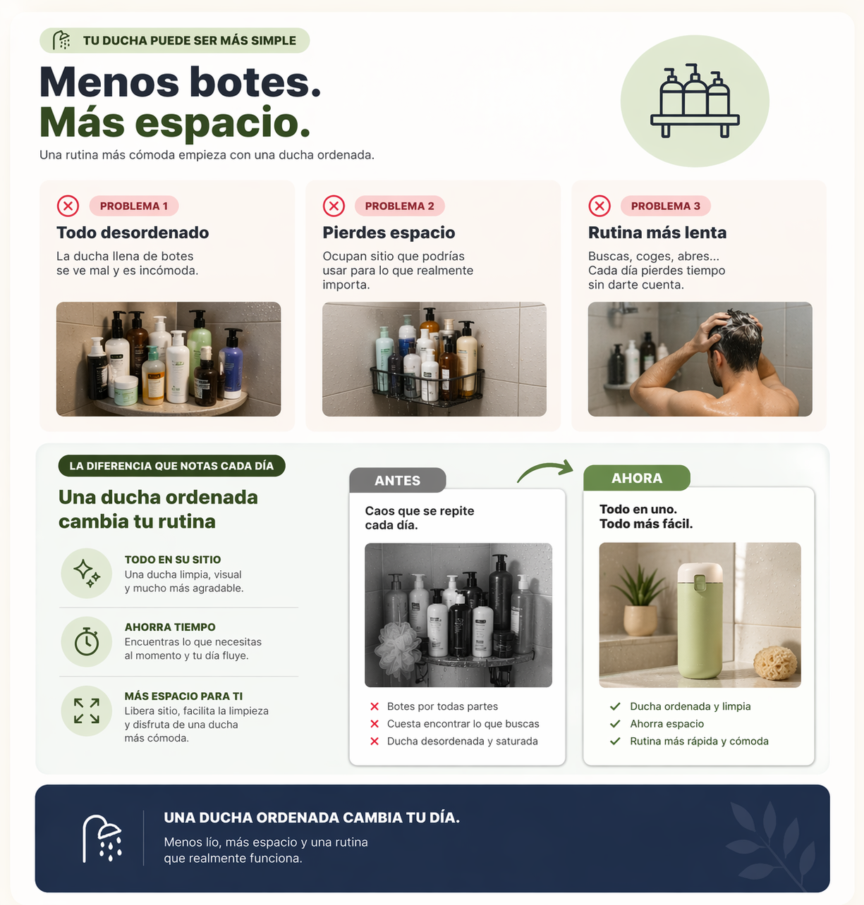 Parece una tontería pero tener todo organizado en un solo bote cambia bastante cuando viajas. Mucho más cómodo y limpio. Ahora lo uso de normal y es muy cómodo para organizar el shampoo y el gel de baño, ahorro muchísimo espacio en la ducha.